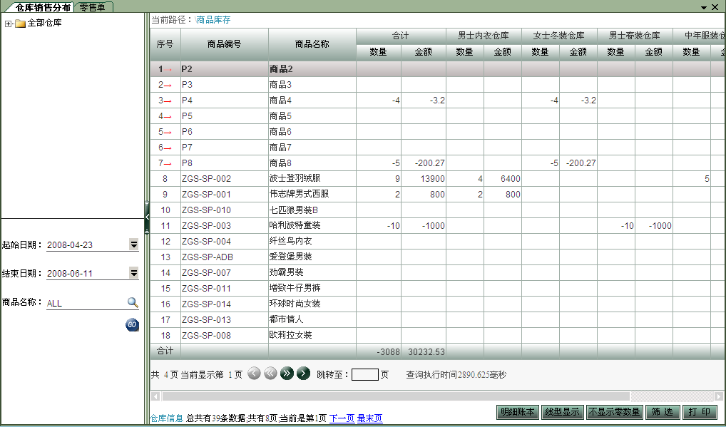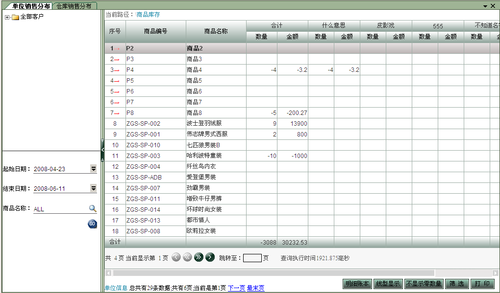 · 線性列表:對(duì)統(tǒng)計(jì)的商品不分類別全部列出,并過(guò)濾掉銷售數(shù)量和金額均為零的商品。