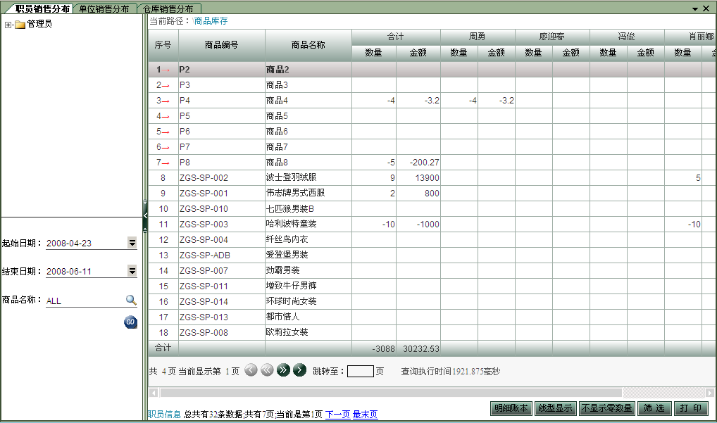 從上圖可以查詢某職員銷售沒(méi)一樣商品的數(shù)量和金額的具體情況。